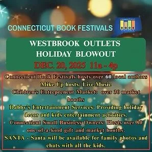 Connecticut Book Festivals returns to Westbrook Outlets for its winter holiday festival, Dec. 20, 2025. It's the final festival before Westbrook Outlets closes for renovations. They're holding nothing back. Over 60 Connecticut Book Festival authors participate in the blowout. You want to be there!
