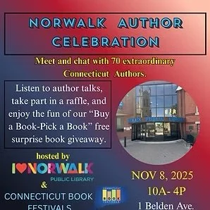 Norwalk Author Celebration is the 9th Annual Norwalk Public Library's author Event. Meet and chat with seventy extraordinary Connecticut Authors. Listen to them give talks on their process and what's next. Take part in a free raffle and have fun with our "Buy-a-Book-Pick-a Book" surprise books.
